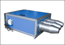 该机组选用铝合金材料制成的多翼式风叶、用薄钢板经喷塑(烤漆)处理并包裹消音材料作为风机外壳,由安装吊环、接线盒、进风口过滤网、可拆卸式检查板、不锈钢金属软管和阻燃塑料制成的喷嘴组成。备有三种机型,采用同种风机,仅因喷嘴配置不同而异,分别有:单喷嘴机组、双喷嘴机组,其喷嘴口径分别为140mm、100mm和80mm 。
